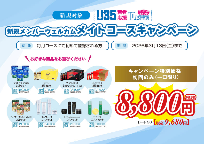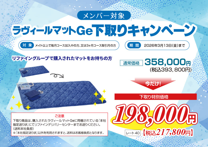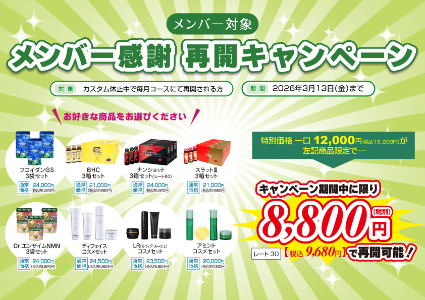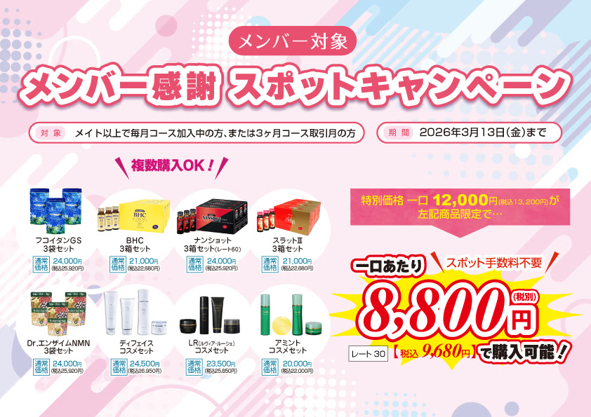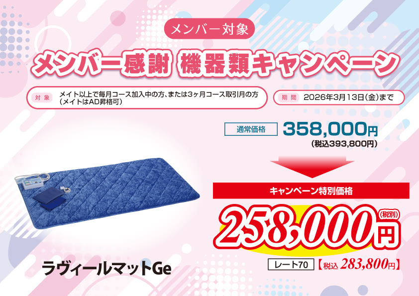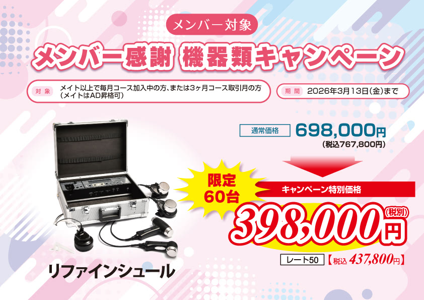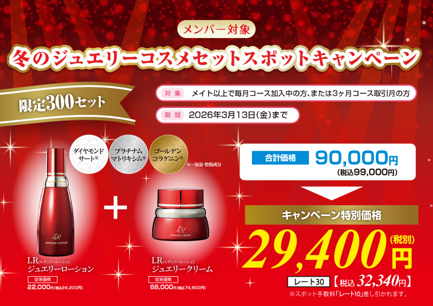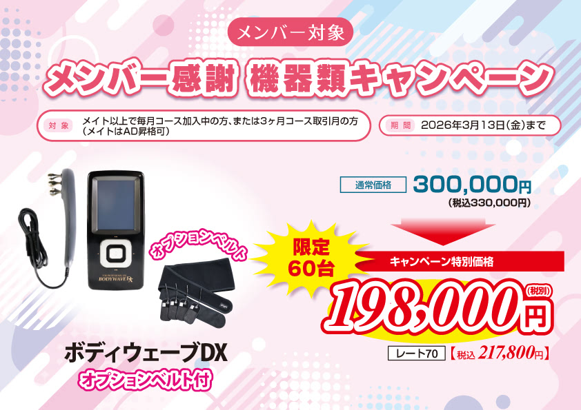 商品ご購入をお考えの方へ 新規対象 新規メンバーウェルカムキャンペーン 期間:2026年3月13日(金)まで メンバー対象メンバー感謝キャンペーン 期間:2026年3月13日(金)まで メンバー対象冬のジュエリーコスメセットキャンペーン 期間:2026年3月13日(金)まで メンバー対象メンバー感謝機器類キャンペーン 期間:2026年3月13日(金)まで